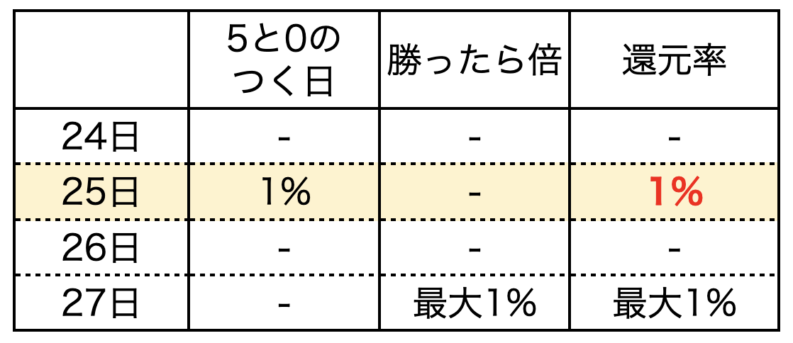今回のマラソンは24日20:00〜27日9:59とかなり短めの開催。各日程の上乗せは以下の通りです。