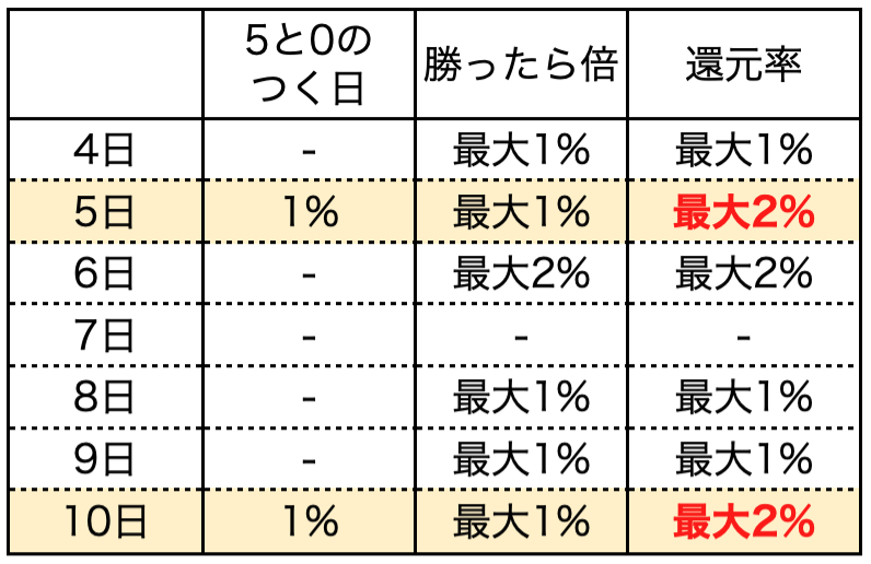 今回のマラソンは10日の1:59までで各日程の上乗せは以下の通り。
