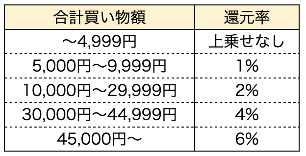 ポイントアップ祭は合計買い物額で還元率が決定するシステムで45,000円以上買うと最大の+6%が適用されます。