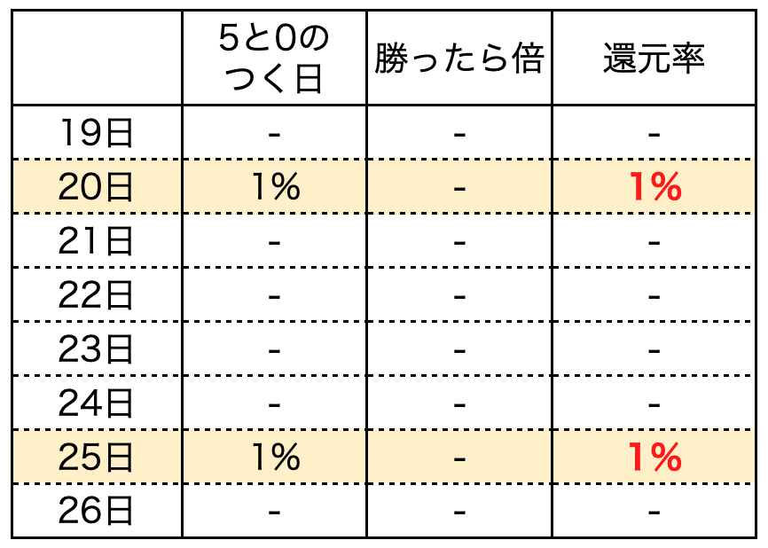 今回は勝ったら倍の開催は無いため基本的には20日か25日狙いでOK。また、初日は開始2時間半額があるので対象ストアでお得なクーポンが出ていれば初日狙いもおすすめです。