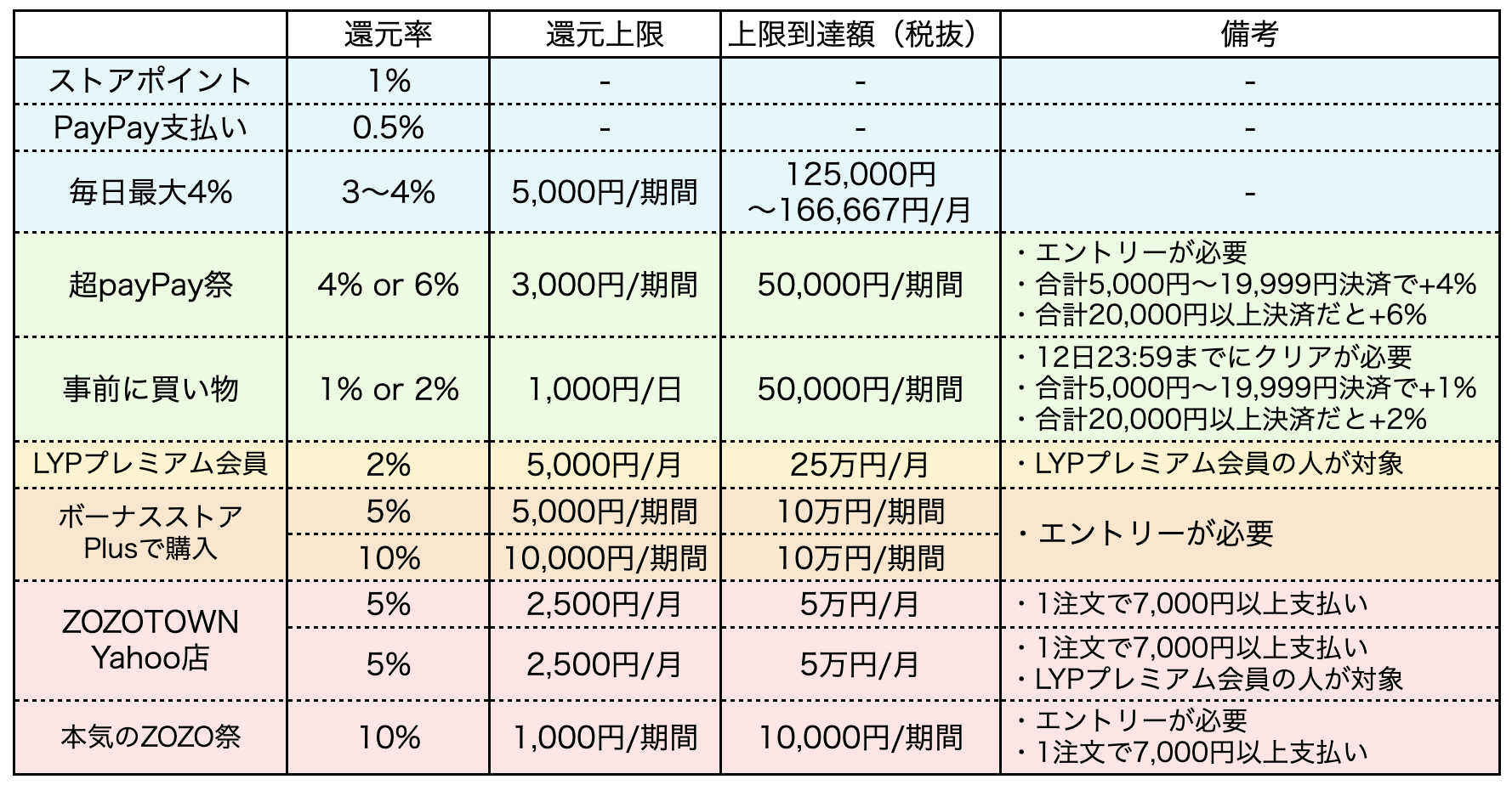 今回の超PayPay祭でお得な買い物額を整理すると以下のようになります。
